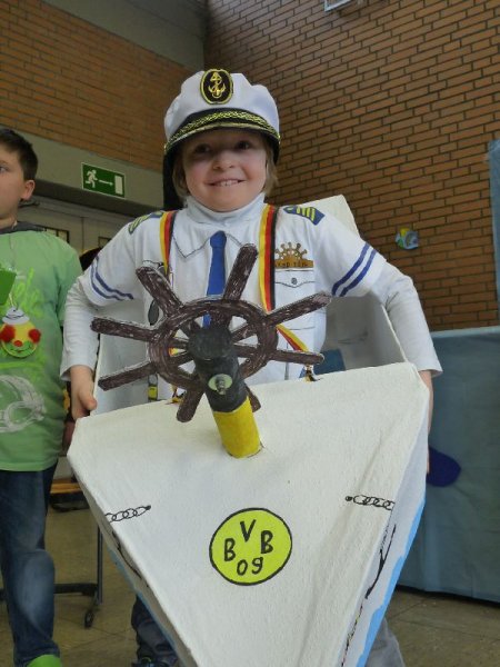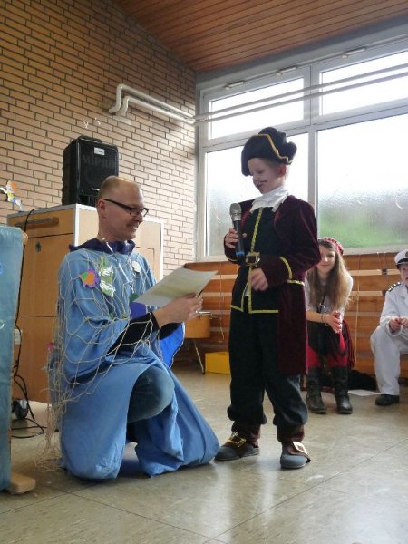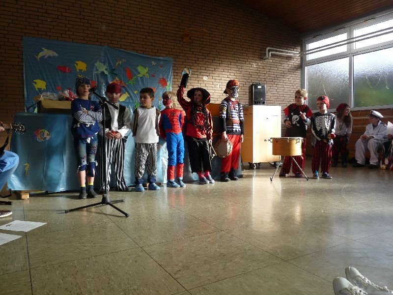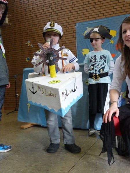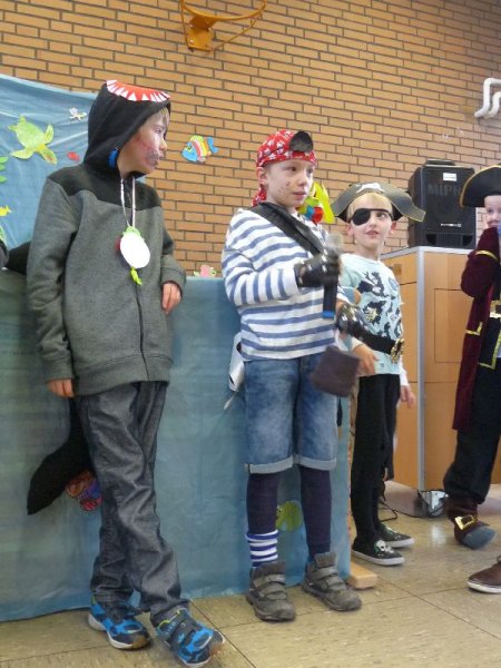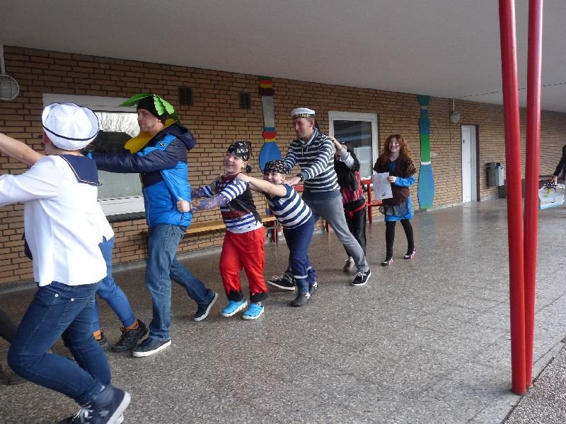 Das Motto unserer Karnevalsfeier war „Auf hoher See“. Die meisten haben sich als Piraten verkleidet. Am tollsten war das Kapitänskostüm mit dem Boot. Herr Gill war eine Insel. In der Pause gab es Hot Dogs zu essen. Zum Schluss haben wir Ballontanz gespielt. Karneval Helau