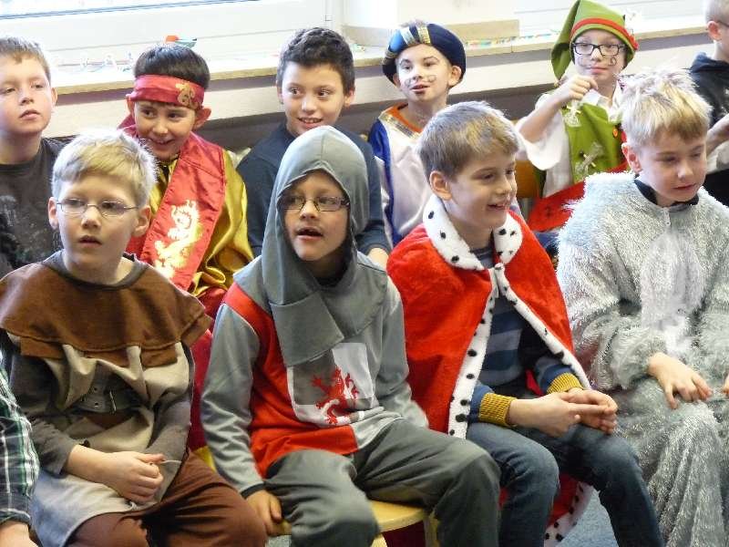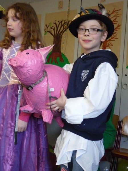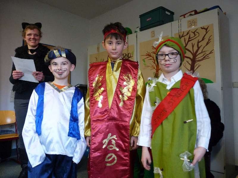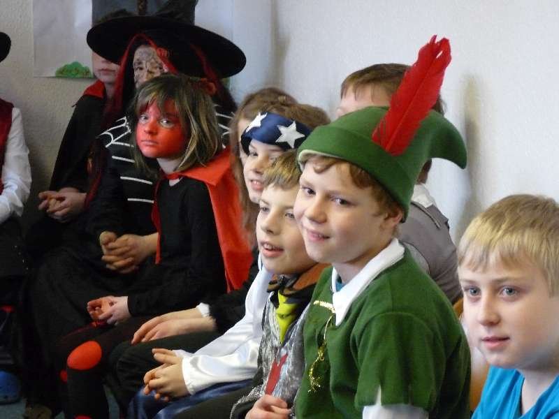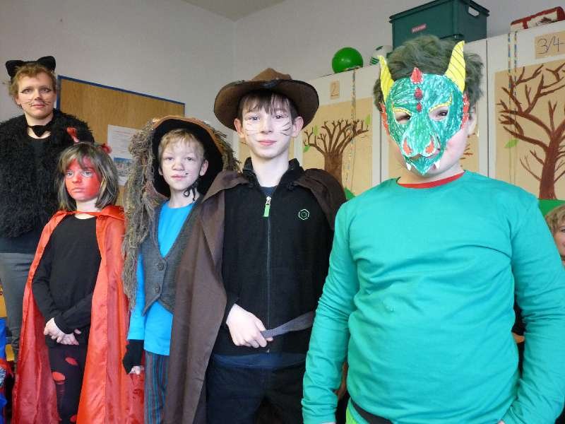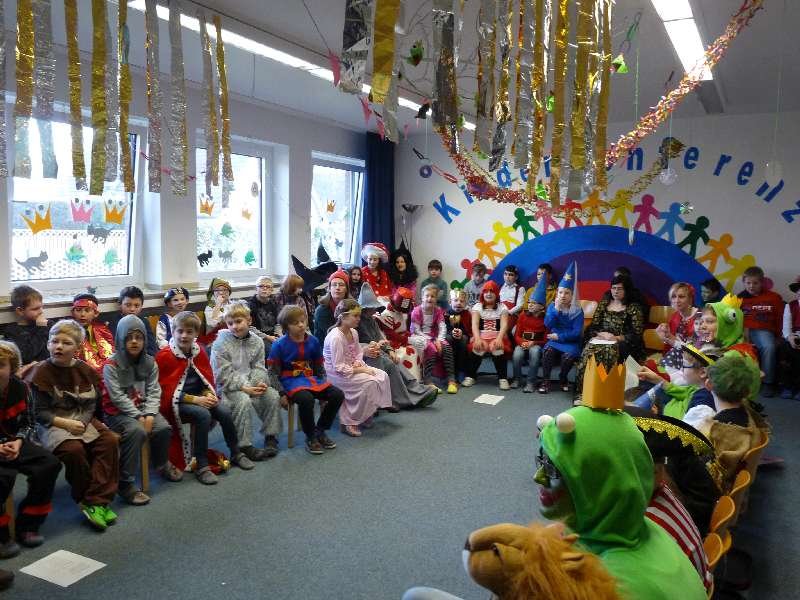 Eingestimmt mit diesen Zeilen begann die diesjährige Karnevalsfeier in der Primarstufe. Die Kinder (und auch Erwachsenen) erschienen als Märchenfiguren verkleidet. Zunächst wurde in den Klassen auf die Feier eingestimmt, dabei wurde auch eine Vorauswahl gemacht, welche Kinder an der Kostümprämierung teilnehmen sollten. Nach einer Hofpause versammelten sich alle im märchenhaft geschmückten Kikoraum. Jede Klasse hatte einen tollen Beitrag vorbereitet, dabei konnte man Dornröschen beim Schlafen und den Zwergen beim Singen zuschauen, bei einer Mitmachgeschichte die Märchenfiguren zum Leben erwecken oder beim Luftballon- und Zeitungstanz selbst aktiv werden. In einer langen Polonäse zogen alle singend durch das Schulgebäude und stärkten sich anschließend bei einem kleinen Imbiss, den Klasse 4 vorbereitet hatte. Als Höhepunkt des Vormittags wurden die schönsten Kostüme prämiert. Tom als „Hans im Glück“, Jo als „Das tapfere Schneiderlein“ und Adrian als „Kartenmensch“ konnten die Jury mit ihren selbst gefertigten Kostümen überzeugen. Nach vielen Helau-Rufen endete eine zauberhafte Feier mit vielen fröhlichen Kindern.
