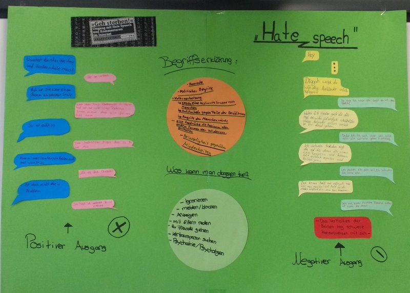 Ausgrenzung und Rassismus sind Erfahrungen, die viele Menschen jeden Tag machen müssen. Im Internet ist “Hate Speech” ein Thema – hasserfülltes Reden über andere, über Minderheiten, über Andersdenkende. An zwei Projekttagen hat sich die Klasse 8-10 mit diesem Themenkreis auseinander gesetzt. Es entstanden ein Plakat und ein Kurzfilm, die sich mit der Thematik befassen. Leo Cresnar von der Jugendbildungsstätte Tecklenburg leitete die Projekttage und stellte sein Wissen unterstützend zur Verfügung. Die Schülerinnen und Schüler teilten sich in zwei Gruppen. Die erste Gruppe sammelte ihre Erfahrungen mit Chats und Kommentaren im Internet. Alle hatten schon Erfahrungen damit gesammelt. Wie läuft eine ungünstige Kommunikation ab? Was kann jeder dafür tun, dass die Teilnehmer an solchenm Chats sich an Regeln halten? Wie wollen wir miteinander umgehen? Diese Fragen bearbeiteten die Schülerinnen und Schüler und erstellten ein Plakat mit Verhaltensregeln und Beispielen für misslingende und gelungene Chats.
